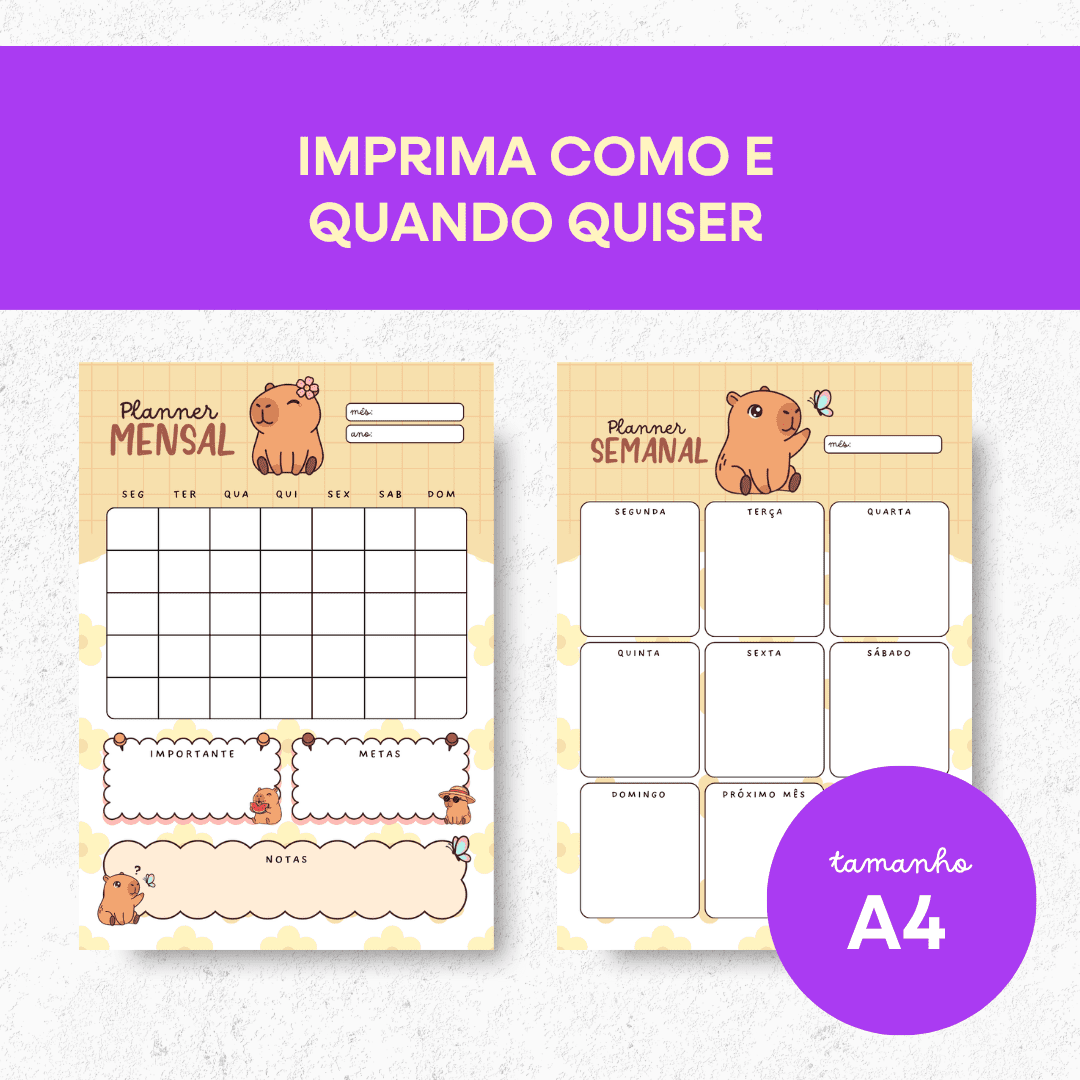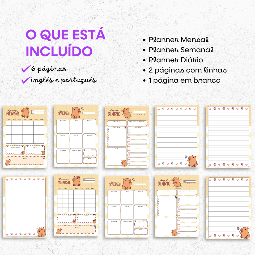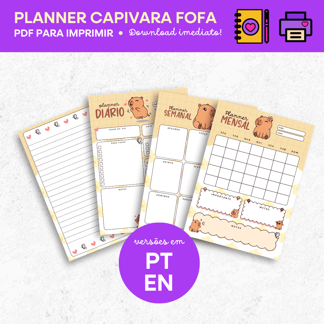 Organiza teus dias com calma e fofura! O Planner Capivara Fofo é perfeito para quem quer planejar a rotina de um jeito leve, criativo e acolhedor. Inspirado na nossa capivara preguiçosamente feliz, ele traz páginas lindas e funcionais para acompanhar teu ritmo sem pressão.